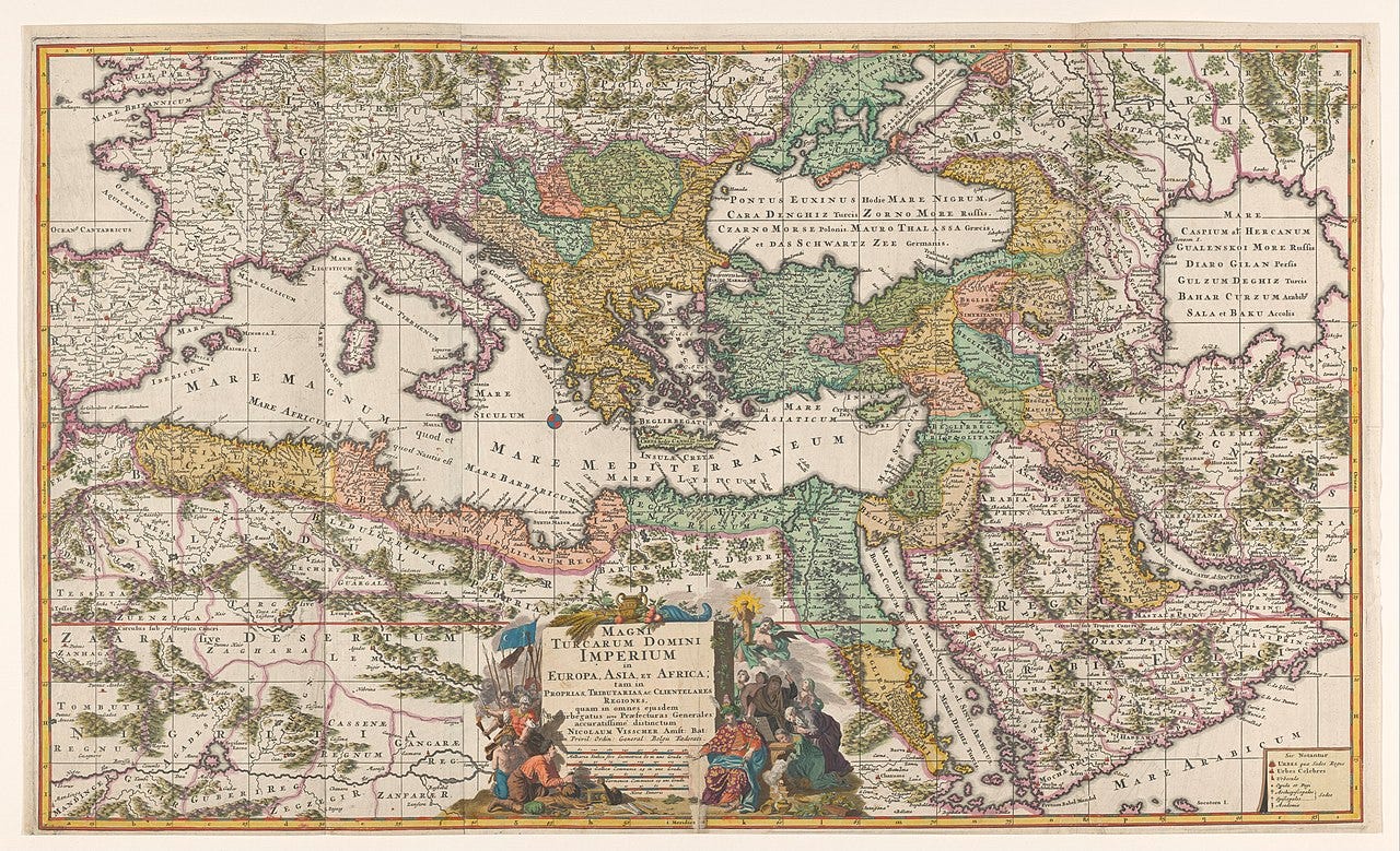 Nicolaes Visscher I was the second in the line of three generations of Dutch Golden Age cartographers. His map of the sprawling Ottoman Empire was drawn at a time of extreme paranoia in Christian Europe. The Turks had been steadily encroaching further and further into the continent since the Fall of Constantinople in 1453. As we can see, the Ottomans had gained almost complete domination of the Black Sea region, the Balkans, and Transylvania by the latter half of the 17th century.
