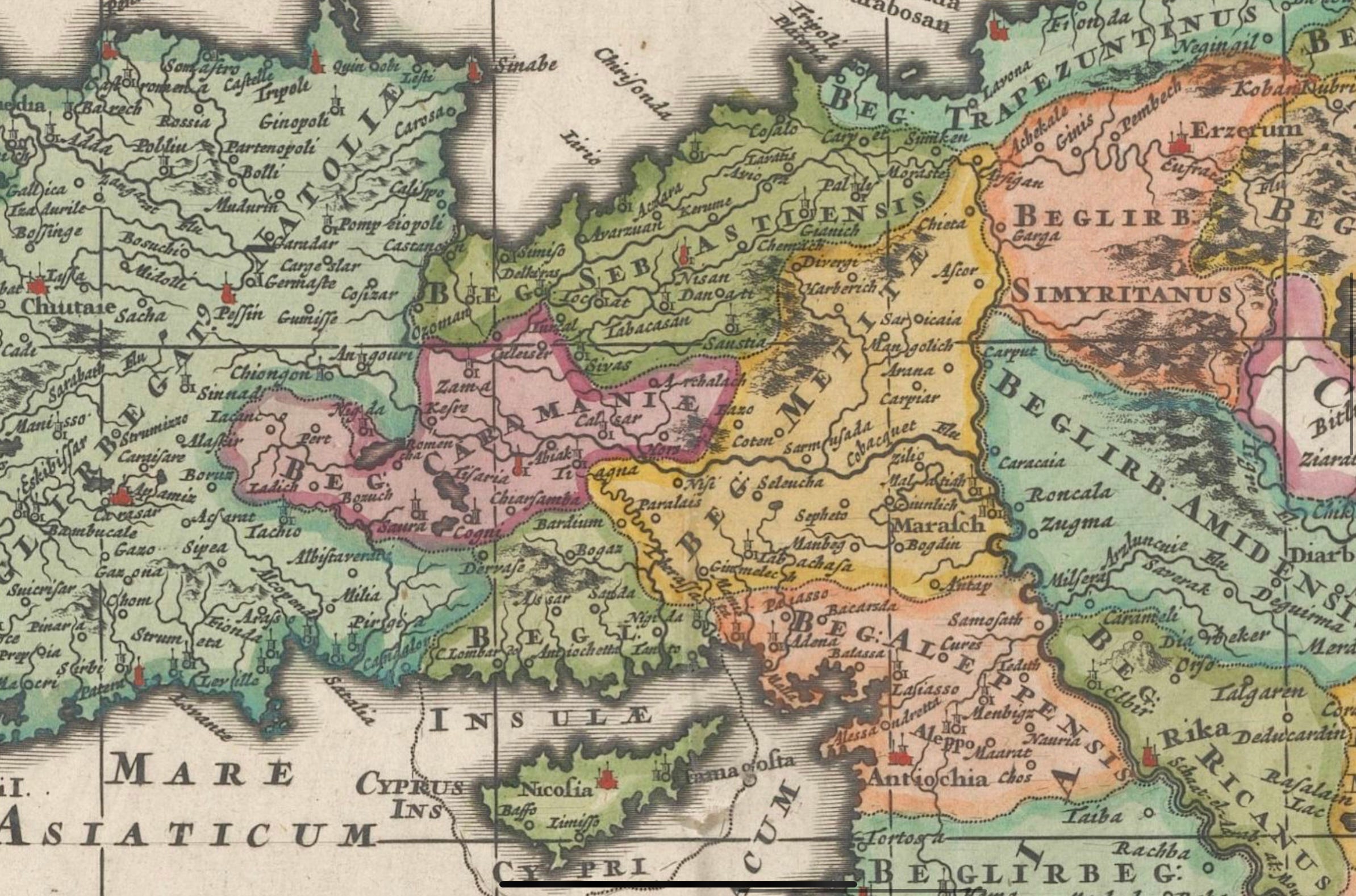 The map’s coloured segments indicate the administrative provinces, or Beylerbeyliks, of the Ottoman empire. The historic region of Cappadocia was not governed as a single entity under the Turks, who instead split it across a few of their provinces. At the centre of the zoomed image of the same map below, Cappadocia would have lain across the pink, yellow, dark and light green segments: