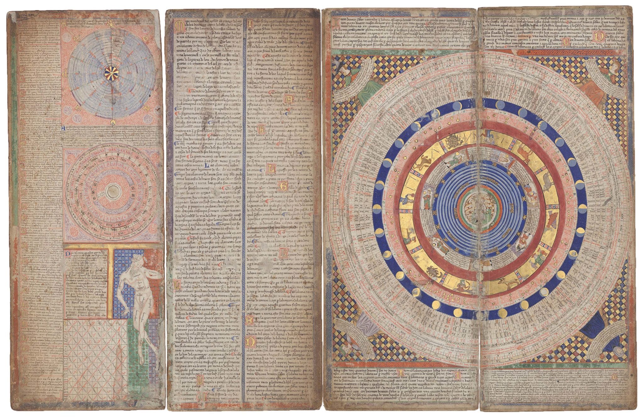 The first two panels of the Catalan Atlas contain texts and diagrams showing the 14th century understanding of the cosmos, turning what would be a work of cartography into a cosmographic enterprise. Containing charts for determining days, tides, holiday dates, and even a little sketch of the human anatomy, these leaves were less for practical use than they were present an image of an ordered cosmos.