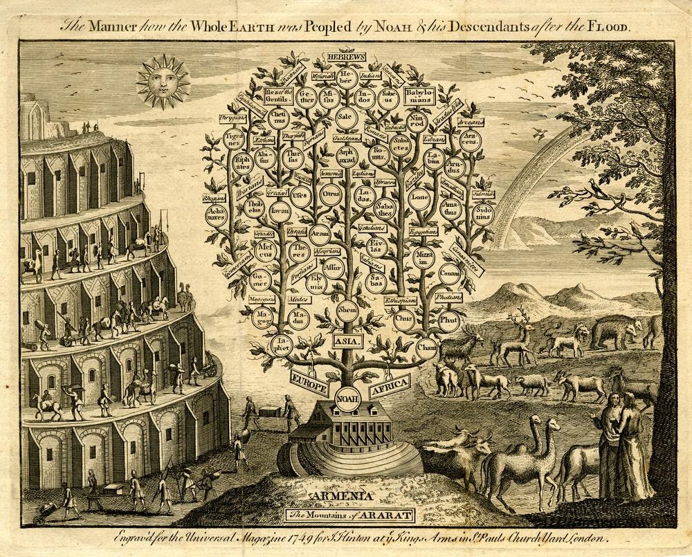 The ‘Table of Nations’ in Genesis 10, compiled over the course of several centuries,3 presents a detailed genealogy of the descendants of Shem, Ham, and Japheth, the peoples for which they’re named, and the regions they came to inhabit. The table makes claims to name all the peoples of the world, but in reality only describes the Eastern Mediterranean and the Ancient Near East, which were the lands known to the Israelites at the time. It seems the author(s) of Genesis 10 looked about their world, and named a descendant of Noah for each of the peoples they saw. Geography through genealogy; a family tree as a map of the world.